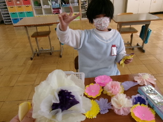 折り紙を立体的にしたり、お花紙をつかっていろいろなお花をつくったりしました。