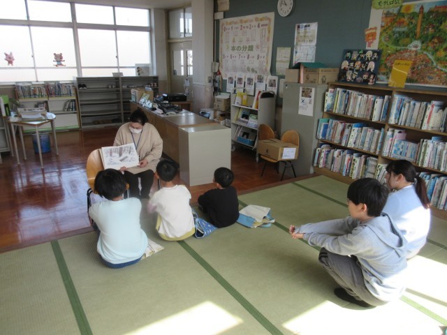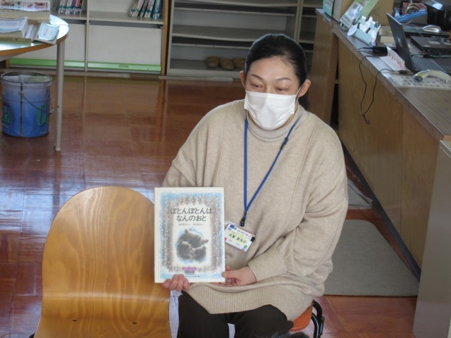 図書館司書の木曽先生に、「ぽとんぽとんはなんのおと」という絵本の読み聞かせをしてもらいました。