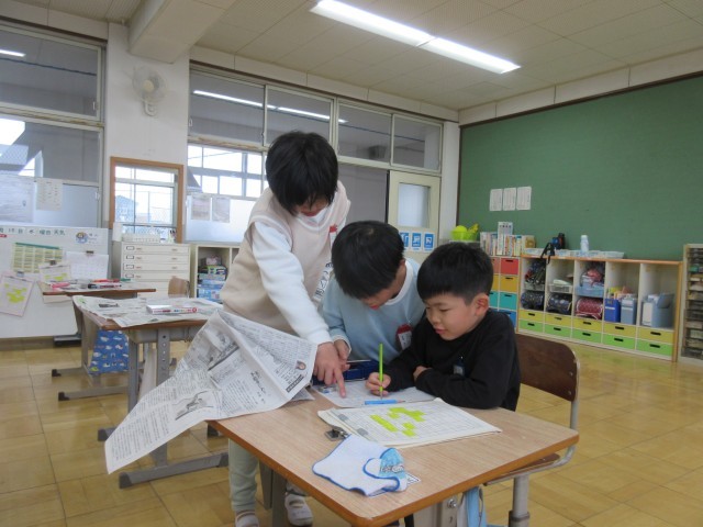 学習予定表を書いている3年生に、5年生がふたり揃って漢字を教えてあげていた姿。