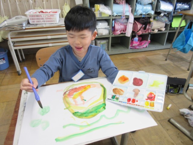 3年生は図画工作「絵の具+水+ふで=いいかんじ!」の学習、5年生は書写・毛筆「草原」です。