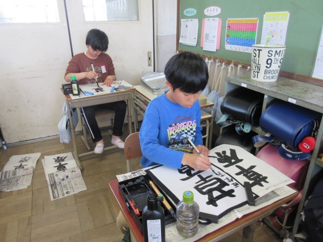 今日の5・6校時は、全員が交流学級で筆を使いました。