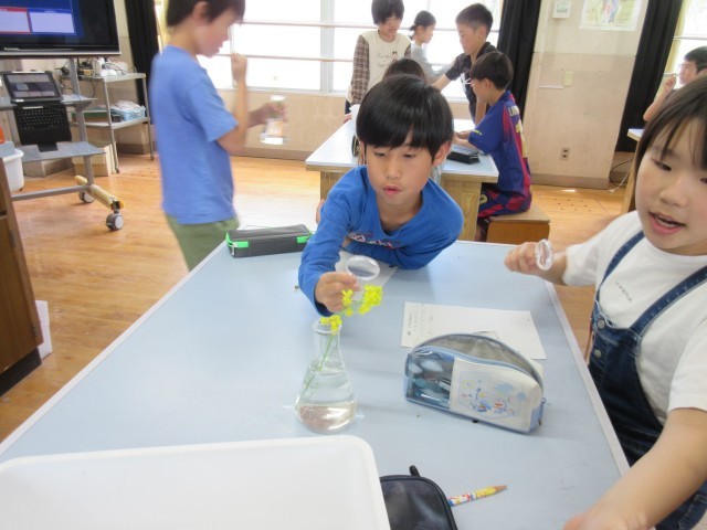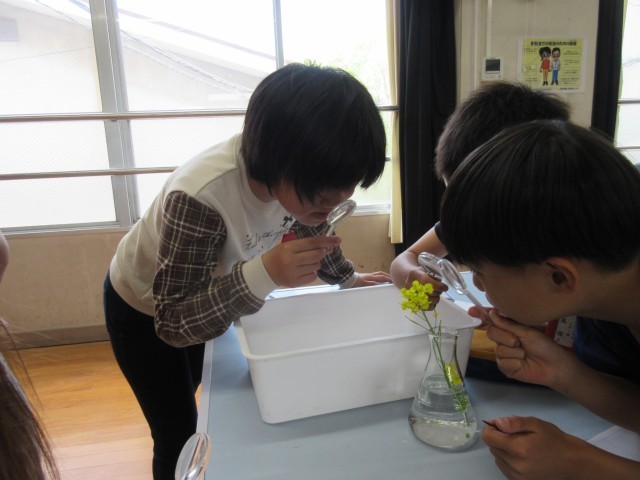 虫眼鏡を使ってアブラナを観察し、ワークシートに記録しました。