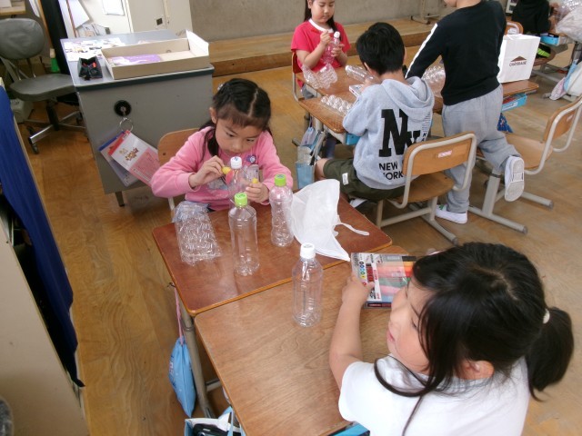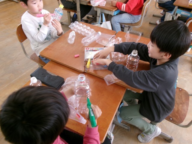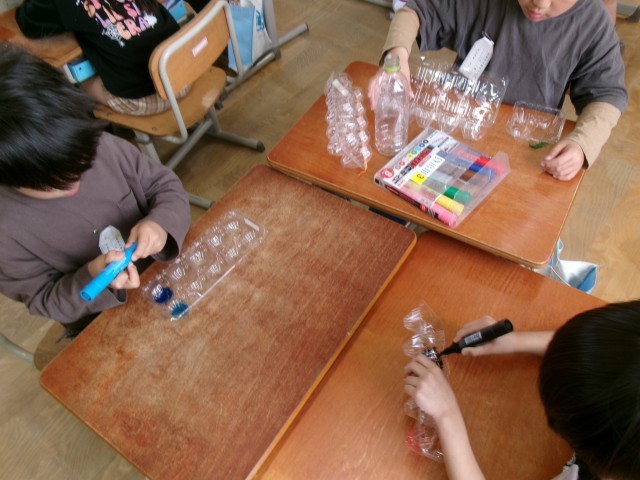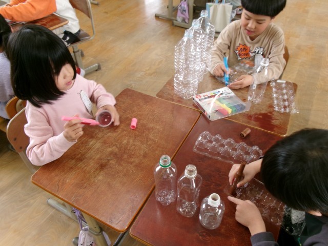 図画工作科の学習中です。光を当てるとどうなるか考えながら作っています。