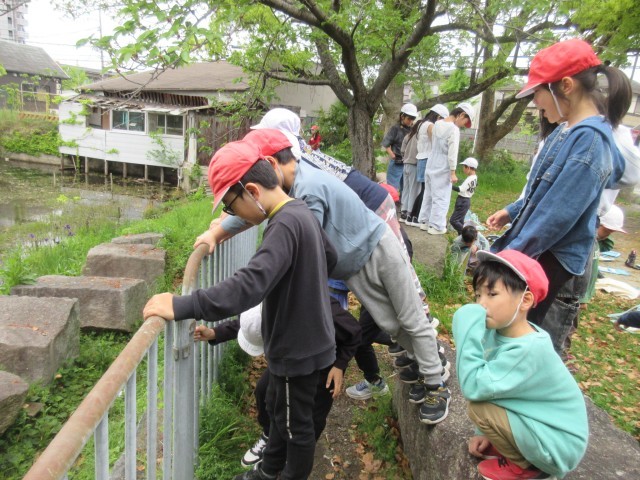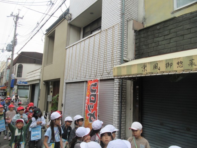 学校のまわりには、どのような場所があるのか、探検しました。淀城跡や、商店街、消防署、交番などを見ました。