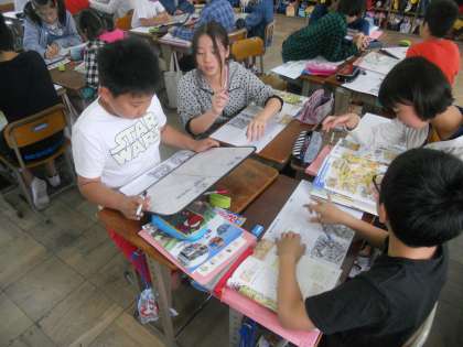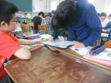 社会の単元ではホワイトボードを使った学習に取り組んでいます。 班で持ち寄った意見を,一生懸命まとめていました。