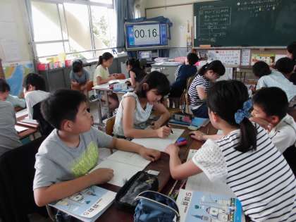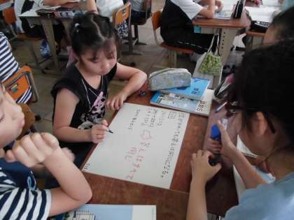 みんなで考えよう 公開日 2017/06/10 更新日 2017/06/10 5年生の部屋 算数の学習で 小数÷小数をしています。 今日は,2,4÷1,6の答えと それぞれを10倍して 24÷16の答えが どうして同じになるの? ということをみんなで考えてみました。 班に一枚,ホワイトボードのようなものをわたし, あーでもない こーでもない と,考えたことを 図や文章で表していました。 班でまとめたものを どんなふうに発表してくれるのか楽しみです!