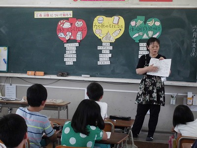 栄養教諭の阿野先生に,赤の食品,黄色の食品,緑の食品について教えてもらいました。「かまぼこは魚からできているなんて,知らなかったです。」「かたくりこがじゃがいもでできているのは知らなくてびっくりしました。」「しょうがは黄色か赤だと思っていました。」などと,いろいろな感想を聞くことができました。食べ物について詳しくなった1時間でした。