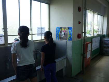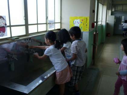 給食が終わりかけの頃に放送で,かえるの合唱のリズムに合わせた「歯磨きの歌」が流れてきます。