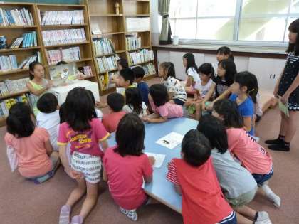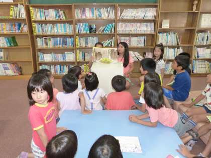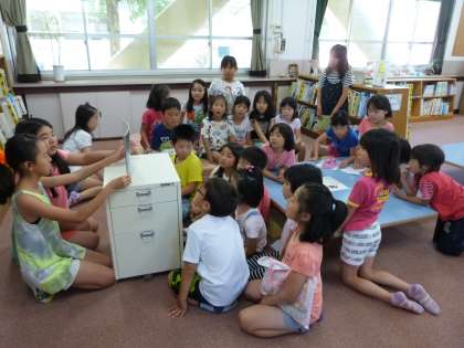 今週は,あじさい読書週間です,その取組の一つとして,高学年の図書委員会の子ども達が中間休みに図書室で紙芝居や本の読み聞かせをしてくれることになっています。その読み聞かせに2回以上参加した人には,素敵な手づくりのしおりがプレゼントされるそうです。お姉さんたちに紙芝居の読み聞かせをしてもらって,とても楽しそうでした。