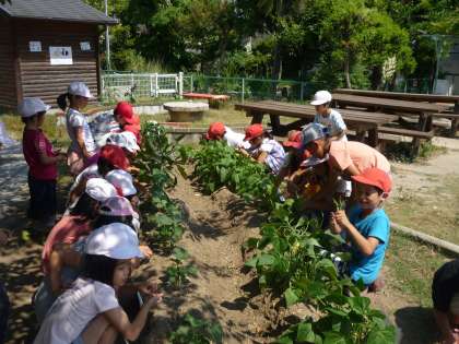 大きくて立派な野菜が育つように,みんなで畑の草むしりをしています。