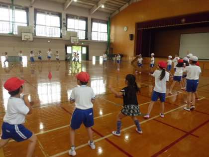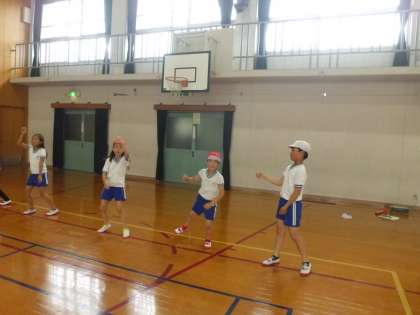 体育でも,みさきの家の準備を進めていて,キャンプファイヤーで踊るダンスの練習をしています。日曜参観では「マイムマイム」を見ていただきましたが,今回は,もう一つの曲。「ジンギスカン」をしました。アップテンポで同じ振付が何度も出てくるので,みんなすぐに覚えられて楽しんでいました。