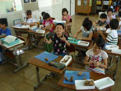 ねんどを「ギュッ!」とにぎり,できた形をもとにして,生きものや食べ物などの,様々なものを制作しました。