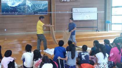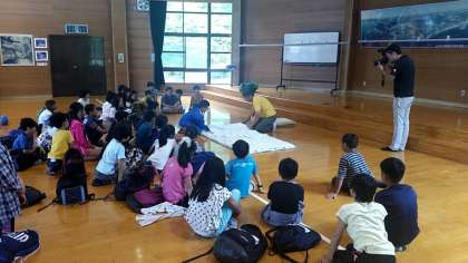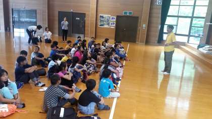 プレーホールに入って所員の方から,寝具の使い方などのオリエンテーションをしてもらいました。シーツや毛布など,来た時よりも美しくたたむことができるでしょうか。