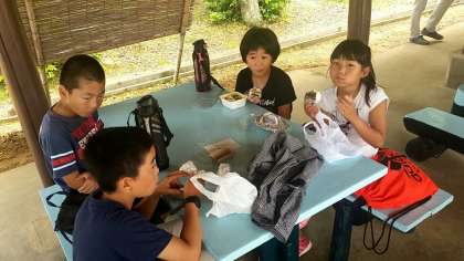 オリエンテーションが終わったら,家からそれぞれが持ってきたおにぎり弁当を食べました。場所は,芝生広場横の東屋です。これから,何度も食事をとる場所になります。保護者の皆様,早朝からお弁当の準備をしていただき,ありがとうございました。