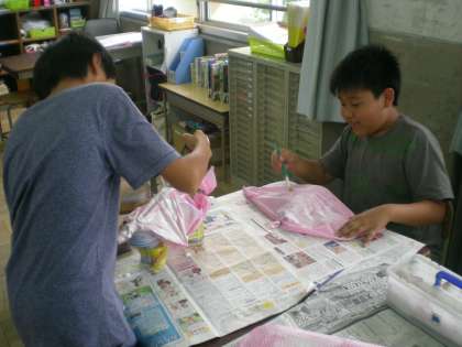 図工の学習では,液体粘土を使い,立体作品をつくっています。