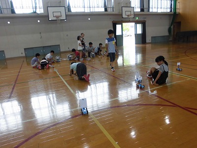 せっかく送風機で風を送っていても,人が前に立ってしまって風の力が変わってしまうなど,正確な実験をするのも難しい3年生ですが,どれだけ車を遠くまで走らせることができるか一生懸命考えていて,こどもたちはとても楽しく学習していました。