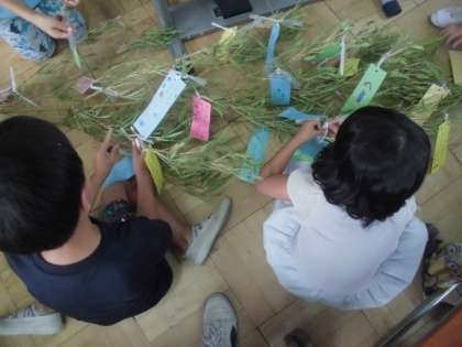 七夕に願い事を書き… みんなに発表しました。思いを込めて笹の葉に