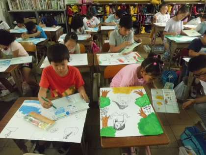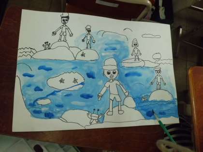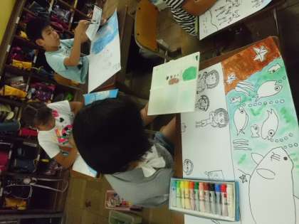 図工では,みさきの家での思い出を絵に表しています。色の重ね方を工夫して取り組んでいます。薄く重ねていくと奥行きが増していくので,とても楽しみながら塗っています。