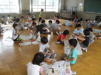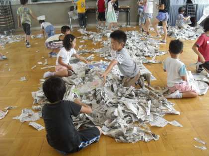 ねじったり,やぶったり,包んでみたり・・・様々な方法で新聞紙と楽しんでいました。