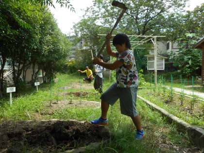 今回は,大根の種まきをしました。まず,スコップや鍬で土をしっかりと耕し,雑草を抜いて,畝を作りました。そして,一定の間隔をあけて穴を掘り,種を蒔きました。この大根を使ってできるメニューをみんなで考えて,調理実習をする予定です。