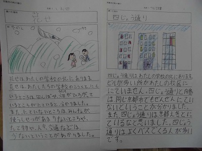 「京都駅」「四条通」「神社やお寺」「久世工業団地」「花背」「向島ニュータウン」などの中から1つ選んで,自分たちの校区と似ているところや違うところをカードにまとめました。