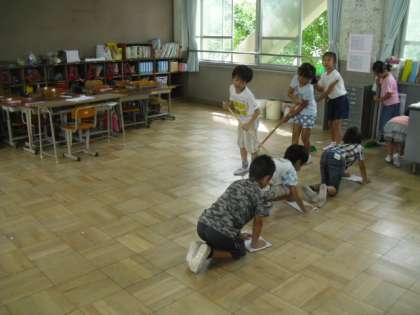 掃除時間には,暑い中ですが,友だちと協力して取り組んでいます。