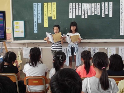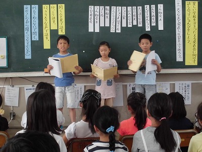 「演劇鑑賞」グループ,クイズも工夫して作っていました。見ないで言えた人もいて,めあてを意識してよく頑張っていました。