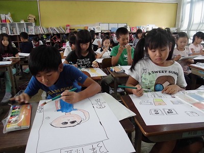 図工は,サインペンでの線がきが終わり,絵の具で色を付けていきました。