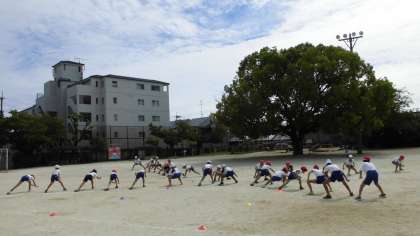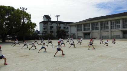 運動場での練習が始まりました!来週は,いよいよ黒Tシャツと法被を着て踊ります。細かいところまで揃うようになってきました。本番まであと1週間!4年生頑張ります。