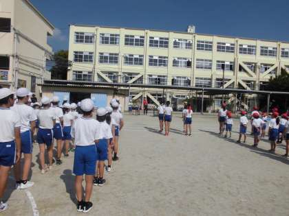 今日から後期がスタートしました。後期始業式の後は,運動会の全校練習を行いました。