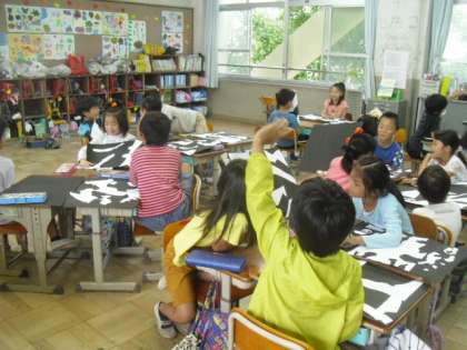 「はさみのあーと」では,自由に切った形の画用紙を組み合わせて,おもしろい世界を作りました。題名をつけましたが,友だちには秘密です。