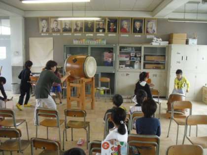 音楽室で本物の和太鼓を使って,お祭りのリズム遊びをしました。
