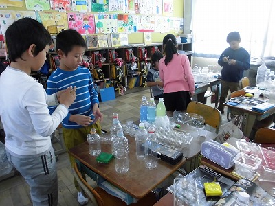 3年生の図工は,透明な容器を組み合わせて,光が通る世界を表現しました。