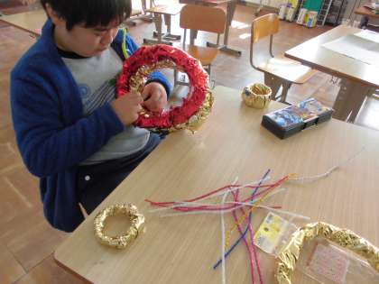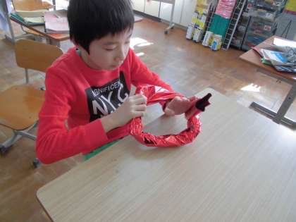 校内図工展の立体作品には,「黄金の龍」を出展します。新聞紙やテープや模造紙の芯に,金色等,きらきら光るホイール紙を巻いて,それらを繋ぎ合わせて作っています。