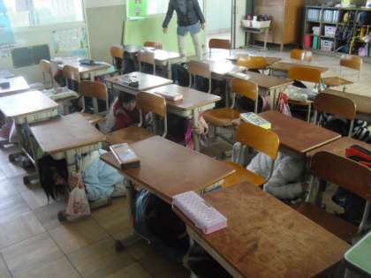 地震が起こったら,まず頭を守ります。