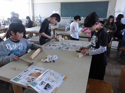 図工展で4年生の素敵な作品も見たので,自分たちもそのようにしたかったと思うのですが,子どもたちに渡されたのは木切れ1本だけ…。