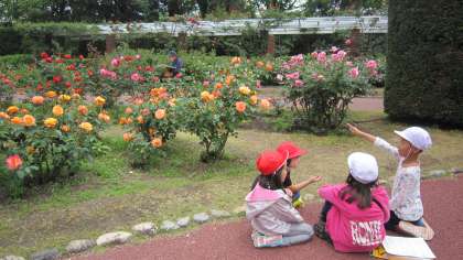 お弁当を食べた後は,お弁当を食べたグループでバラ園を中心にウォ—クラリーをしました。グループのメンバーで協力して,並木の木やバラ園の中にある大きな木の名前を答えたり,見つけた花の絵を描いたりしました。1年生にやさしく力強く声をかけてくれた2年生,2年生の言うことを一生懸命聞こうとする1年生。短い時間だったかもしれませんが,たくさん交流ができました。
