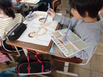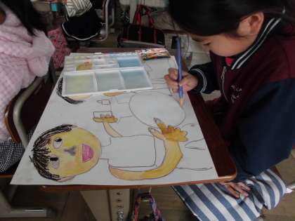 水の量や、くすのきのまわりの長さを測ったときの様子を写真にとり、その写真をモデルに絵をかいています。