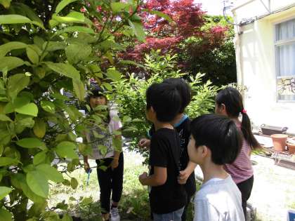 今日は理科の時間にチョウの幼虫をとりに行きました。