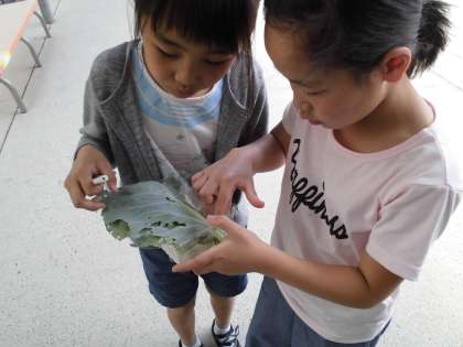 キャベツの裏からモンシロチョウのたまごと幼虫を見つけたり、木からアゲハ蝶の幼虫を採取していました。