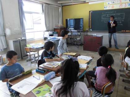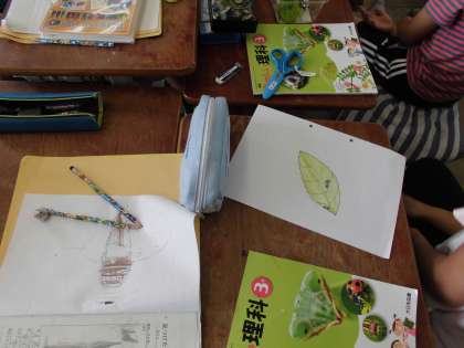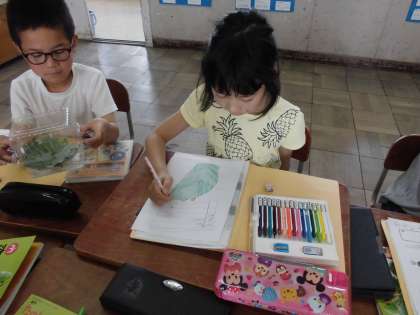 教室に戻って、採ってきた幼虫やたまごをスケッチしている様子です。