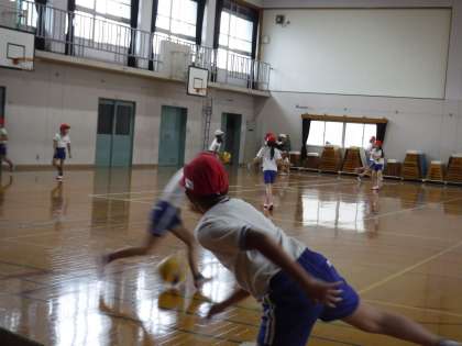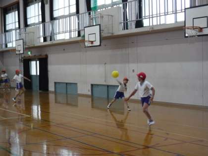 今日の体育は,雨が降っていて「ベースボール」ができなかったので,体育館で「めちゃぶつけ」をしました!