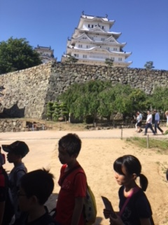 姫路城の見学を終え,岡山のホテルに向かいいます。雲1つ無い青空に,白く美しい姫路城をくっきりと見ることができました。