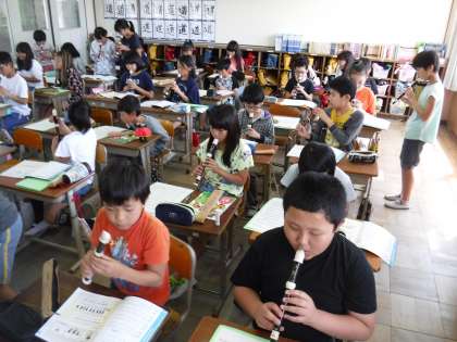 音楽の学習では,リコーダーのテストのためにペアを組んで練習しています!