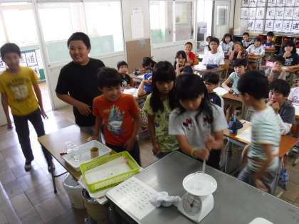 理科の学習は,古田先生にお世話になっていますが,先週から仮説実験授業という授業のしかたで,担任と一緒に「空気と水」の学習をしています。