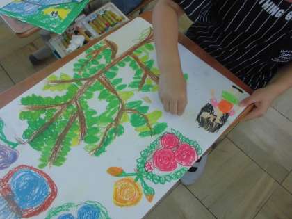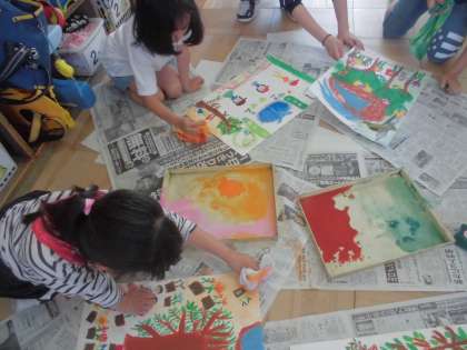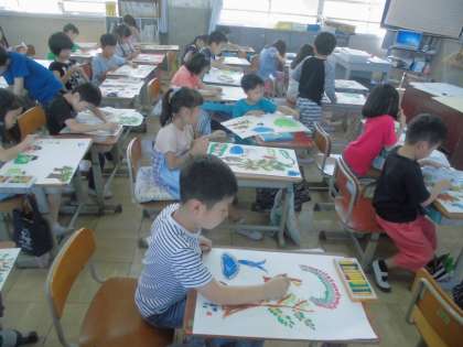 図画工作科では,「たのしかったよ どきどきしたよ」の学習をしました。春の遠足の様子を描きました。