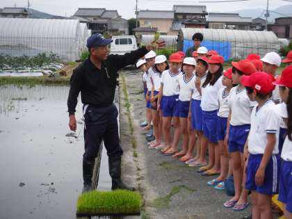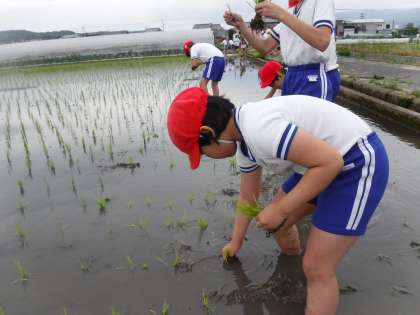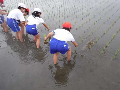本日,3,4時間目に地域の方にお世話になり「田植え体験」をさせていただきました。