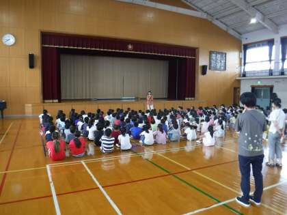 今日の朝会では,龍谷大学の学生さんの「地域の方に母校の校歌を届ける」という企画のために,校歌の録音をしていただきました。