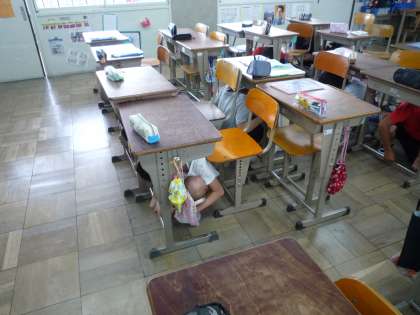 音が聞こえるとすぐに机の下に隠れて