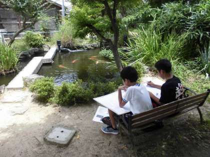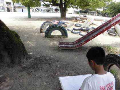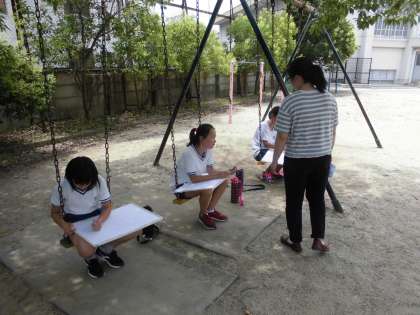 図工の時間には,向島小学校のお気に入りの風景の絵を描き始めました。校庭の大きなクスノキを選んだり,廊下から見える宇治川の景色を選んだり,校庭の横にあるミニ巨椋池の景色を選んだり,タイヤや総合遊具などを選んだ子もいました。どの子も,しっかりと景色を見ながら構図を工夫し,大きな画用紙に下書きを描いていました。思い出に残る作品を作ることができればと思います。